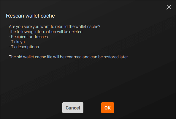 3) Next, a dialog window will appear informing that your current wallet cache will clear all information stored about recipient addresses, transaction keys, and transaction descriptions.